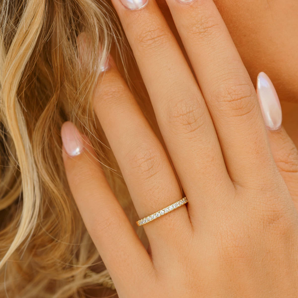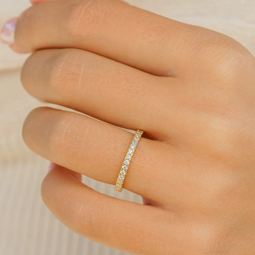 Dive into the allure of the 2mm Half Eternity Wedding Band where chic meets enduring romance. This exquisitely designed 2mm half eternity band, expertly shaped from top-tier 925 sterling silver, is more than just a ring; it symbolizes an everlasting connection and unmatched grace. This ring's mesmerizing radiance comes alive with precision-set dazzling stones, creating a sparkling charm that captures the dance of every gleam. This ring is the embodiment of eternal dedication.