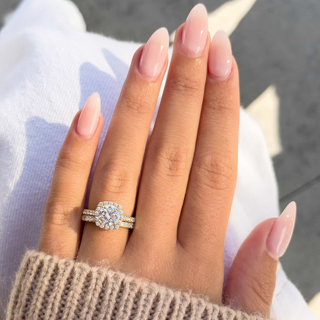 Introducing our Cushion Halo Wedding Set, where craftsmanship meets enchantment in a jaw-dropping cushion halo engagement ring set designed to steal her breath away.
