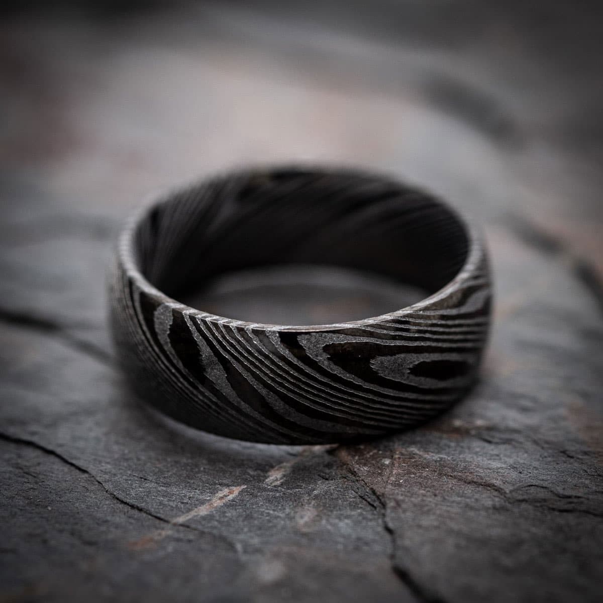 Nightshade, a handcrafted ring made from unique Damascus steel, is for those embracing bold choices. Artisans expertly layer steel with intense pressure and heat, followed by an acid bath to enhance its character. Resulting in a rich graphite shade with a distinctive wood grain pattern, each ring is polished to a partly smooth finish, showcasing a captivating shine. This ancient blacksmithing technique, used for centuries, has crafted some of history's most exquisite Damascus steel knives.