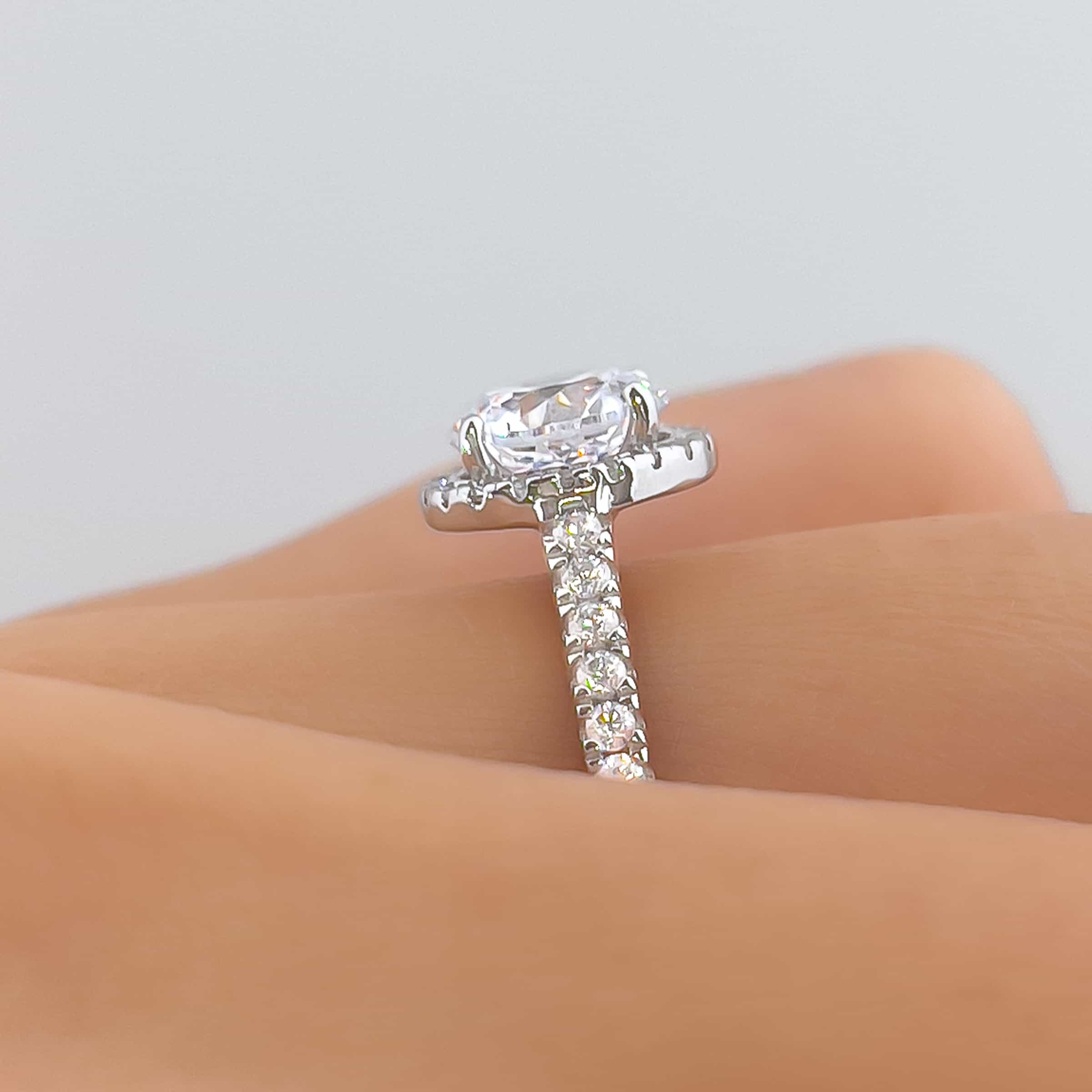 Unveiling the Round Halo Engagement Ring Set: a timeless masterpiece destined to spark eternal joy. With a stunning 1.5 carat round-cut center stone embraced by a celestial halo, this set, crafted from sterling silver, emanates an irresistible glow.